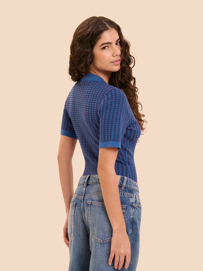 • Polo-style neckline at the front.